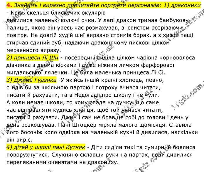 Знайдіть і виразно прочитайте портрети персонажів: 1) драконихи - Крізь скельця блискучих окулярів дивилися маленькі колючі очки. У лапі дракон тримав бамбукову палицю, якою він увесь час розмахував, зі свистом розрізаючи повітря. На довгій худій шиї виразно стримів борак, а з хижої пащі стирчав єдиний зуб, надаючи драконячому пискові цілком мерзенного виразу. 2) принцеси Лі Ши - посередині сиділа цілком чарівна чорноволоса дівчинка з двома кісками і дуже ніжним личком фарфорової мигдальської лялечки. Це була маленька принцеса Лі Сі. 3) Джима Ґудзика -У якійсь іншій країні хлопець, певно, с"идів би за шкільною партою і потроху вчився читати, писати й рахувати, та в Недогадії про школу і не чули. А коли немає школи, то кому спаде на думку, що саме час відправляти кудись хлопця, щоб той учився читати, писати й рахувати. Джим і сам не брав це собі до голови і день у день розкошував. Пані Штоцкер міряла малого щомісяця. Ставила його босоніж коло одвірка на маленькій кухні й дивилася, наскільки він виріс. 4) дітей у школі пані Кутняк - Діти сиділи тихі та сумирні й боялися поворухнутися. Слухняно склавши руки на партах, вони дивилися переляканими оченятами на дракониху.