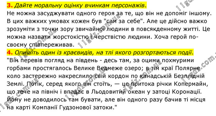 3. Дайте моральну оцінку вчинкам персонажів. Не можна засуджувати одного героя за те, що він не допоміг іншому. В цих важких умовах кожен був "сам за себе". Але це дійсно важко зрозуміти з точки зору звичайної людини в повсякденному житті. Це можна назвати жорстокістю і черствістю людини. Хоча герой по-своєму співпереживав. 4. Опишіть один із краєвидів, на тлі якого розгортаються події. "Він перевів погляд на південь - десь там, за оцими похмурими горбами простягалось Велике Ведмеже озеро; в тім краї Полярне коло застережно накреслило свій кордон по канадській Безплідній Землі. Потік, серед якого він стоїть, — це притока річки Копермайн, що тече на північ і впадає в Льодовитий океан у затоці Коронації. Йому не доводилось там бувати, але він одного разу бачив ті місця на карті Компанії Гудзонової затоки."