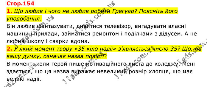 1. Що любив і чого не любив робити Грегуар? Поясніть його уподобання. Він любив фантазувати, дивитися телевізор, вигадувати власні машини і прилади, займатися ремонтом і поділками з дідусем. А не любив школу і сварки вдома. 2. У який момент твору «35 кіло надії» з’являється число 35? Що, на вашу думку, означає назва повісті? В момент, коли герой пише мотиваційного листа до коледжу. Мені здається, що ця назва виражає невеликий розмір хлопця, що має великі надії.