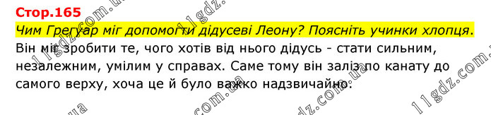 Чим Грегуар міг допомогти дідусеві Леону? Поясніть учинки хлопця. Він міг зробити те, чого хотів від нього дідусь - стати сильним, незалежним, умілим у справах. Саме тому він заліз по канату до самого верху, хоча це й було важко надзвичайно.