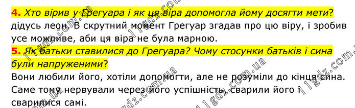 4. Хто вірив у Грегуара і як ця віра допомогла йому досягти мети? дідусь леон. В скрутний момент Грегуар згадав про цю віру, і зробив усе можливе, аби ця віра не була марною. 5. Як батьки ставилися до Грегуара? Чому стосунки батьків і сина були напруженими? Вони любили його, хотіли допомогти, але не розуміли до кінця сина. Саме тому нервували через його успішність, сварили його і сварилися самі.