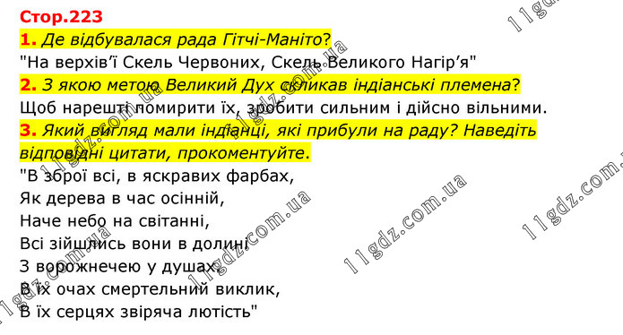 1. Де відбувалася рада Гітчі-Маніто? "На верхів’ї Скель Червоних, Скель Великого Нагір’я" 2. З якою метою Великий Дух скликав індіанські племена? Щоб нарешті помирити їх, зробити сильним і дійсно вільними. 3. Який вигляд мали індіанці, які прибули на раду? Наведіть відповідні цитати, прокоментуйте. "В зброї всі, в яскравих фарбах, Як дерева в час осінній, Наче небо на світанні, Всі зійшлись вони в долині З ворожнечею у душах. В їх очах смертельний виклик, В їх серцях звіряча лютість"