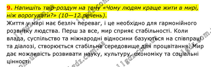 Напишіть твір-роздум на тему «Чому людям краще жити в мирі, ніж ворогувати?» (10—12 речень). Життя у мирі має безліч переваг, і це необхідно для гармонійного розвитку людства. Перш за все, мир сприяє стабільності. Коли влада, суспільство та міжнародні відносини базуються на співпраці та діалозі, створюється стабільне середовище для процвітання. Мир дає можливість розвивати науку, культуру, економіку та соціальні цінності.