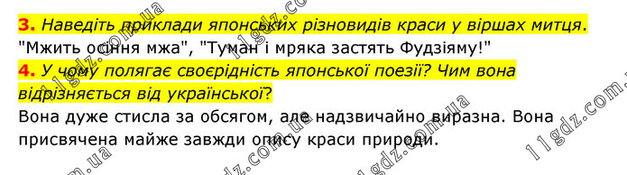 3. Наведіть приклади японських різновидів краси у віршах митця. "Мжить осіння мжа", "Туман і мряка застять Фудзіяму!" 4. У чому полягає своєрідність японської поезії? Чим вона відрізняється від української? Вона дуже стисла за обсягом, але надзвичайно виразна. Вона присвячена майже завжди опису краси природи.