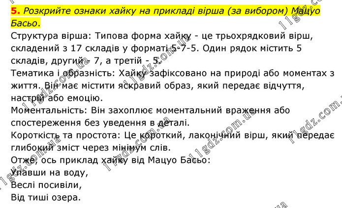 Розкрийте ознаки хайку на прикладі вірша (за вибором) Мацуо Басьо. Структура вірша: Типова форма хайку - це трьохрядковий вірш, складений з 17 складів у форматі 5-7-5. Один рядок містить 5 складів, другий - 7, а третій - 5. Тематика і образність: Хайку зафіксовано на природі або моментах з життя. Він має містити яскравий образ, який передає відчуття, настрій або емоцію. Моментальність: Він захоплює моментальний враження або спостереження без уведення в деталі. Короткість та простота: Це короткий, лаконічний вірш, який передає глибокий зміст через мінімум слів. Отже, ось приклад хайку від Мацуо Басьо: Упавши на воду, Веслі посивіли, Від тиші озера.