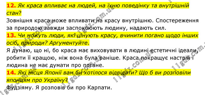 12. Як краса впливає на людей, на їхню поведінку та внутрішній стан? Зовнішня краса може впливати на красу внутрішню. Спостереження за природою завжди заспокоюють людину, надають сил. 13. Чи можуть люди, які цінують красу, вчинити погано щодо інших осіб, природи? Аргументуйте. Я думаю, що ні, бо краса має виховувати в людині естетичні ідеали, робити її кращою, ніж вона була раніше. Краса покращує настрій і людина не має думати про погане. 14. Які місця Японії вам би хотілося відвідати? Що б ви розповіли японцям про Україну? Фудзіяму. Я розповів би про Карпати.