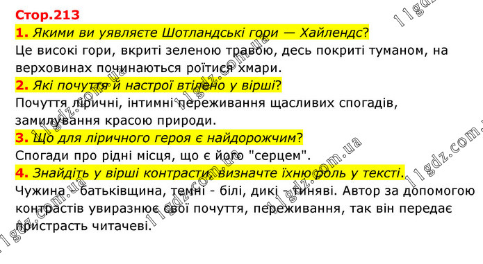 1. Якими ви уявляєте Шотландські гори — Хайлендс? Це високі гори, вкриті зеленою травою, десь покриті туманом, на верховинах починаються роїтися хмари. 2. Які почуття й настрої втілено у вірші? Почуття ліричні, інтимні переживання щасливих спогадів, замилування красою природи. 3. Що для ліричного героя є найдорожчим? Спогади про рідні місця, що є його "серцем". 4. Знайдіть у вірші контрасти, визначте їхню роль у тексті. Чужина - батьківщина, темні - білі, дикі - тиняві. Автор за допомогою контрастів увиразнює свої почуття, переживання, так він передає пристрасть читачеві.
