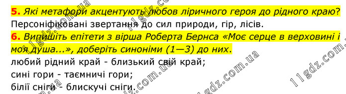 5. Які метафори акцентують любов ліричного героя до рідного краю? Персоніфіковані звертання до сил природи, гір, лісів. 6. Випишіть епітети з вірша Роберта Бернса «Моє серце в верховині і моя душа...», доберіть синоніми (1—3) до них. любий рідний край - близький свій край; сині гори - таємничі гори; білії сніги - блискучі сніги.