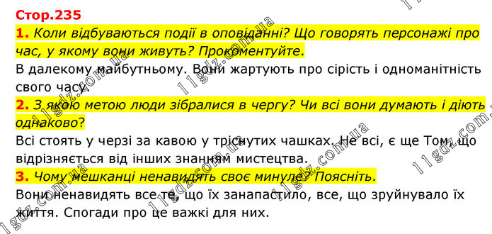 1. Коли відбуваються події в оповіданні? Що говорять персонажі про час, у якому вони живуть? Прокоментуйте. В далекому майбутньому. Вони жартують про сірість і одноманітність свого часу. 2. З якою метою люди зібралися в чергу? Чи всі вони думають і діють однаково? Всі стоять у черзі за кавою у тріснутих чашках. Не всі, є ще Том, що відрізняється від інших знанням мистецтва. 3. Чому мешканці ненавидять своє минуле? Поясніть. Вони ненавидять все те, що їх занапастило, все, що зруйнувало їх життя. Спогади про це важкі для них.