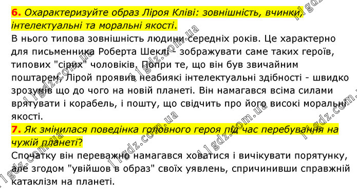 6. Охарактеризуйте образ Ліроя Кліві: зовнішність, вчинки, інтелектуальні та моральні якості. В нього типова зовнішність людини середніх років. Це характерно для письменника Роберта Шеклі - зображувати саме таких героїв, типових "сірих" чоловіків. Попри те, що він був звичайним поштарем, Лірой проявив неабиякі інтелектуальні здібності - швидко зрозумів що до чого на новій планеті. Він намагався всіма силами врятувати і корабель, і пошту, що свідчить про його високі моральні якості. 7. Як змінилася поведінка головного героя під час перебування на чужій планеті? Спочатку він переважно намагався ховатися і вичікувати порятунку, але згодом "увійшов в образ" своїх уявлень, спричинивши справжній катаклізм на планеті.