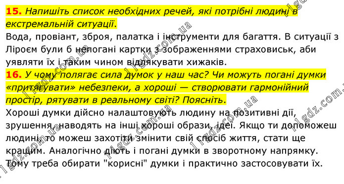 15. Напишіть список необхідних речей, які потрібні людині в екстремальній ситуації. Вода, провіант, зброя, палатка і інструменти для багаття. В ситуації з Ліроєм були б непогані картки з зображеннями страховиськ, аби уявляти їх і таким чином відлякувати хижаків. 16. У чому полягає сила думок у наш час? Чи можуть погані думки «притягувати» небезпеки, а хороші — створювати гармонійний простір, рятувати в реальному світі? Поясніть. Хороші думки дійсно налаштовують людину на позитивні дії, зрушення, наводять на інші хороші образи, ідеї. Якщо ти допоможеш людині, то можеш захотіти змінити свій спосіб життя, стати ще кращим. Аналогічно діють і погані думки в зворотному напрямку. Тому треба обирати "корисні" думки і практично застосовувати їх.