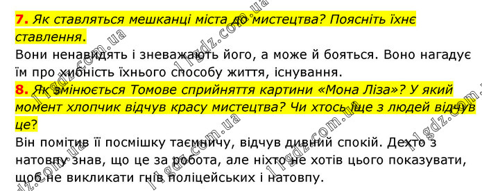 7. Як ставляться мешканці міста до мистецтва? Поясніть їхнє ставлення. Вони ненавидять і зневажають його, а може й бояться. Воно нагадує їм про хибність їхнього способу життя, існування. 8. Як змінюється Томове сприйняття картини «Мона Ліза»? У який момент хлопчик відчув красу мистецтва? Чи хтось іще з людей відчув це? Він помітив її посмішку таємничу, відчув дивний спокій. Дехто з натовпу знав, що це за робота, але ніхто не хотів цього показувати, щоб не викликати гнів поліцейських і натовпу.