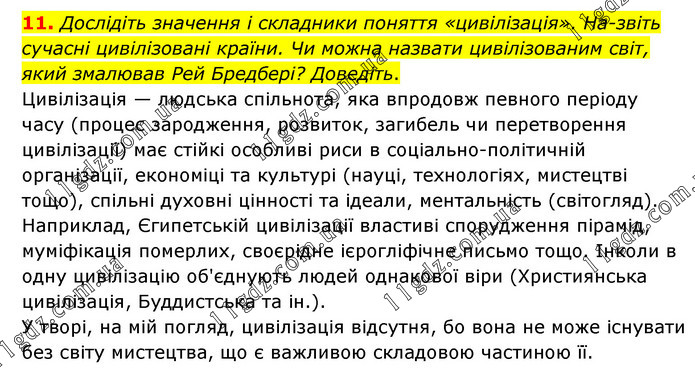 Дослідіть значення і складники поняття «цивілізація». На-звіть сучасні цивілізовані країни. Чи можна назвати цивілізованим світ, який змалював Рей Бредбері? Доведіть. Цивілізація — людська спільнота, яка впродовж певного періоду часу (процес зародження, розвиток, загибель чи перетворення цивілізації) має стійкі особливі риси в соціально-політичній організації, економіці та культурі (науці, технологіях, мистецтві тощо), спільні духовні цінності та ідеали, ментальність (світогляд). Наприклад, Єгипетській цивілізації властиві спорудження пірамід, муміфікація померлих, своєрідне ієрогліфічне письмо тощо. Інколи в одну цивілізацію об'єднують людей однакової віри (Християнська цивілізація, Буддистська та ін.). У творі, на мій погляд, цивілізація відсутня, бо вона не може існувати без світу мистецтва, що є важливою складовою частиною її.