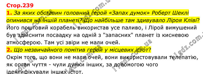 1. За яких обставин головний герой «Запах думок» Роберт Шеклі опинився на іншій планеті? Що найбільше там здивувало Ліроя Кліві? Його поштовий корабель використав усе паливо, і Лірой вимушений був здійснити посаадку на одній з "запасних" планет із кисневою атмосферою. Там усі звіри не мали очей. 2. Що незвичайного помітив герой у місцевих істот? Окрім того, що вони не мали очей, вони використовували телепатію, як орган чуття - чули думки інших, за допомогою чого ідентифікували інших істот.