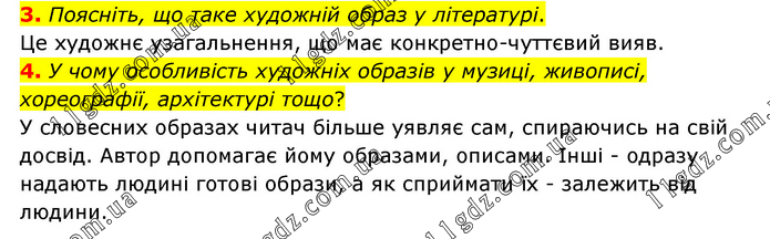 3. Поясніть, що таке художній образ у літературі. Це художнє узагальнення, що має конкретно-чуттєвий вияв. 4. У чому особливість художніх образів у музиці, живописі, хореографії, архітектурі тощо? У словесних образах читач більше уявляє сам, спираючись на свій досвід. Автор допомагає йому образами, описами. Інші - одразу надають людині готові образи, а як сприймати їх - залежить від людини.