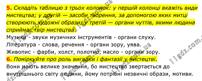 5. Складіть таблицю з трьох колонок: у першій колонці вкажіть види мистецтва; у другій — засоби творення, за допомогою яких митці створюють художні образи; у третій — органи чуттів, якими людина сприймає твір мистецтва. Музика - звуки музичних інструментів - органи слуху. Література - слова, речення - органи зору, уява. Живопис - фарби, холст, полотно, масло - органи зору. 6. Поміркуйте про роль вигадки і фантазії у мистецтві. Вони мають велике значення, бо мистецтво звертається до внутрішнього світу людини, йому потрібні незвичні образи, мотиви.