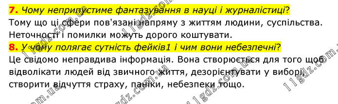 7. Чому неприпустиме фантазування в науці і журналістиці? Тому що ці сфери пов'язані напряму з життям людини, суспільства. Неточності і помилки можуть дорого коштувати. 8. У чому полягає сутність фейків1 і чим вони небезпечні? Це свідомо неправдива інформація. Вона створюється для того щоб відволікати людей від звичного життя, дезорієнтувати у виборі, створити відчуття страху, паніки, небезпеки тощо.