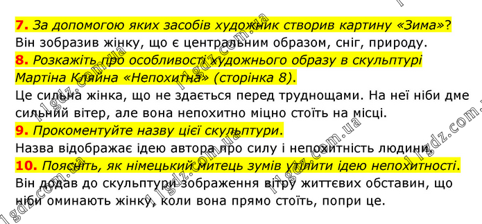 7. За допомогою яких засобів художник створив картину «Зима»? Він зобразив жінку, що є центральним образом, сніг, природу. 8. Розкажіть про особливості художнього образу в скульптурі Мартіна Кляйна «Непохитна» (сторінка 8). Це сильна жінка, що не здається перед труднощами. На неї ніби дме сильний вітер, але вона непохитно міцно стоїть на місці. 9. Прокоментуйте назву цієї скульптури. Назва відображає ідею автора про силу і непохитність людини. 10. Поясніть, як німецький митець зумів утілити ідею непохитності. Він додав до скульптури зображення вітру життєвих обставин, що ніби оминають жінку, коли вона прямо стоїть, попри це.