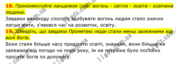 18. Прокоментуйте ланцюжок слів: вогонь - світло - освіта - освічена людина. Завдяки винаходу способу здобувати вогонь людям стало значно легше жити, з'явився час на розвиток, освіту. 19. Доведіть, що завдяки Прометею люди стали менш залежними від волі богів. Вони стали більше часу приділяти освіті, знанням, вони більше не залежали від погоди чи пори року, їм не потрібно було постійно просити богів по допомогу.
