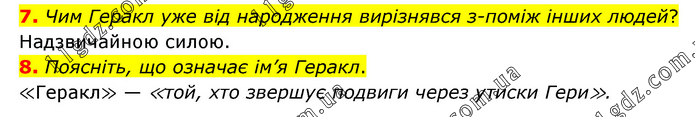 7. Чим Геракл уже від народження вирізнявся з-поміж інших людей? Надзвичайною силою. 8. Поясніть, що означає ім’я Геракл. ≪Геракл≫ — ≪той, хто звершує подвиги через утиски Гери≫.