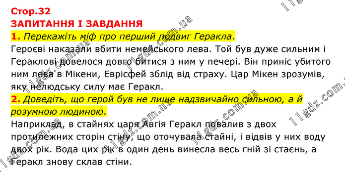 ЗАПИТАННЯ І ЗАВДАННЯ 1. Перекажіть міф про перший подвиг Геракла. Героєві наказали вбити немейського лева. Той був дуже сильним і Гераклові довелося довго битися з ним у печері. Він приніс убитого ним лева в Мікени, Еврісфей зблід від страху. Цар Мікен зрозумів, яку нелюдську силу має Геракл. 2. Доведіть, що герой був не лише надзвичайно сильною, а й розумною людиною. Наприклад, в стайнях царя Авгія Геракл повалив з двох протилежних сторін стіну, що оточувала стайні, і відвів у них воду двох рік. Вода цих рік в один день винесла весь гній зі стаєнь, а Геракл знову склав стіни.