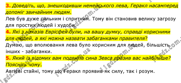 3. Доведіть, що, знешкодивши немейського лева, Геракл насамперед допоміг звичайним людям. Лев був дуже сильним і спритним. Тому він становив велику загрозу для простих людей і худоби. 4. Які з наказів Еврісфея були, на вашу думку, справді корисними для людей, а які можна назвати забаганками правителя? Думаю, що вполювання лева було корисним для людей, більшість інших - забаганки. 5. Який із відомих вам подвигів сина Зевса вразив вас найбільше? Поясніть чому. Авгієві стайні, тому що Геракл проявив як силу, так і розум.