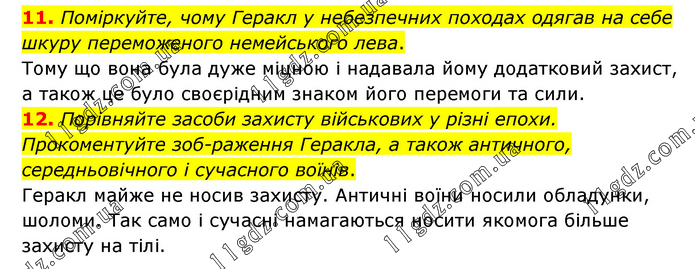 11. Поміркуйте, чому Геракл у небезпечних походах одягав на себе шкуру переможеного немейського лева. Тому що вона була дуже міцною і надавала йому додатковий захист, а також це було своєрідним знаком його перемоги та сили. 12. Порівняйте засоби захисту військових у різні епохи. Прокоментуйте зображення Геракла, а також античного, середньовічного і сучасного воїнів. Геракл майже не носив захисту. Античні воїни носили обладунки, шоломи. Так само і сучасні намагаються носити якомога більше захисту на тілі.
