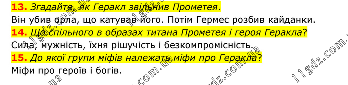 13. Згадайте, як Геракл звільнив Прометея. Він убив орла, що катував його. Потім Гермес розбив кайданки. 14. Що спільного в образах титана Прометея і героя Геракла? Сила, мужність, їхня рішучість і безкомпромісність. 15. До якої групи міфів належать міфи про Геракла? Міфи про героїв і богів.