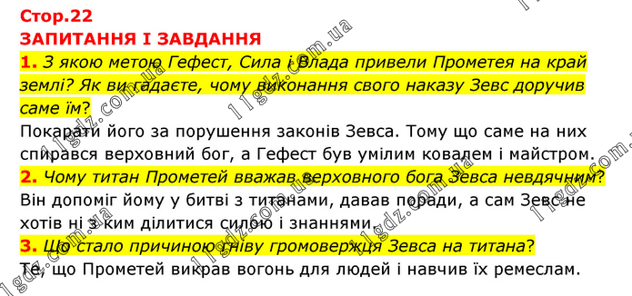 ЗАПИТАННЯ І ЗАВДАННЯ 1. З якою метою Гефест, Сила і Влада привели Прометея на край землі? Як ви гадаєте, чому виконання свого наказу Зевс доручив саме їм? Покарати його за порушення законів Зевса. Тому що саме на них спирався верховний бог, а Гефест був умілим ковалем і майстром. 2. Чому титан Прометей вважав верховного бога Зевса невдячним? Він допоміг йому у битві з титанами, давав поради, а сам Зевс не хотів ні з ким ділитися силою і знаннями. 3. Що стало причиною гніву громовержця Зевса на титана? Те, що Прометей викрав вогонь для людей і навчив їх ремеслам.