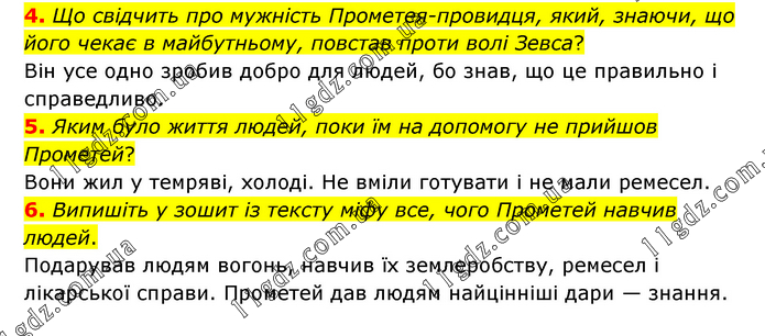 4. Що свідчить про мужність Прометея-провидця, який, знаючи, що його чекає в майбутньому, повстав проти волі Зевса? Він усе одно зробив добро для людей, бо знав, що це правильно і справедливо. 5. Яким було життя людей, поки їм на допомогу не прийшов Прометей? Вони жил у темряві, холоді. Не вміли готувати і не мали ремесел. 6. Випишіть у зошит із тексту міфу все, чого Прометей навчив людей. Подарував людям вогонь, навчив їх землеробству, ремесел і лікарської справи. Прометей дав людям найцінніші дари — знання.