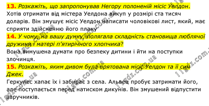 13. Розкажіть, що запропонував Негору полоненій місіс Уелдон. Хотів отримати від містера Уелдона викуп у розмірі ста тисяч доларів. Він змушує місіс Уелдон написати чоловікові лист, який, має сприяти здійсненню його плану 14. У чому, на вашу думку, полягала складність становища люблячої дружини і матері п’ятирічного хлопчика? Вона вимушена думати про безпеку дитини і йти на поступки злочинця. 15. Розкажіть, яким дивом була врятована місіс Уелдон та її син Джек. Геркулес хапає їх і забирає з села. Альвец пробує затримати його, але поступається перед натиском дикунів. Він змушений відпустити заручників.