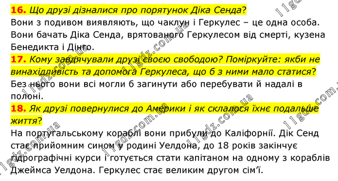 16. Що друзі дізналися про порятунок Діка Сенда? Вони з подивом виявляють, що чаклун і Геркулес – це одна особа. Вони бачать Діка Сенда, врятованого Геркулесом від смерті, кузена Бенедикта і Дінго. 17. Кому завдячували друзі своєю свободою? Поміркуйте: якби не винахідливість та допомога Геркулеса, що б з ними мало статися? Без нього вони всі могли б загинути або перебувати й надалі в полоні. 18. Як друзі повернулися до Америки і як склалося їхнє подальше життя? На португальському кораблі вони прибули до Каліфорнії. Дік Сенд стає прийомним сином у родині Уелдона, до 18 років закінчує гідрографічні курси і готується стати капітаном на одному з кораблів Джеймса Уелдона. Геркулес стає великим другом сім’ї.
