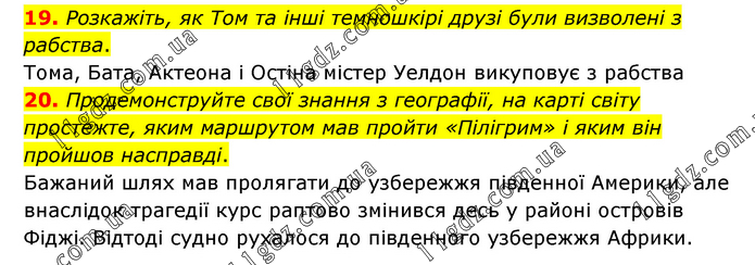 19. Розкажіть, як Том та інші темношкірі друзі були визволені з рабства. Тома, Бата, Актеона і Остіна містер Уелдон викуповує з рабства 20. Продемонструйте свої знання з географії, на карті світу простежте, яким маршрутом мав пройти «Пілігрим» і яким він пройшов насправді. Бажаний шлях мав пролягати до узбережжя південної Америки, але внаслідок трагедії курс раптово змінився десь у районі островів Фіджі. Відтоді судно рухалося до південного узбережжя Африки.