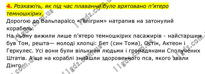 Розкажіть, як під час плавання було врятовано п’ятеро темношкірих. Дорогою до Вальпараїсо «Пілігрим» натрапив на затонулий корабель. На ньому вижили лише п’ятеро темношкірих пасажирів - найстаршим був Том, решта— молоді хлопці: Бет (син Тома), Остін, Актеон і Геркулес. Усі вони були вільними людьми і громадянами Сполучених Штатів. А ще на кораблі знайшли здоровенного пса, якого звали Дінго.