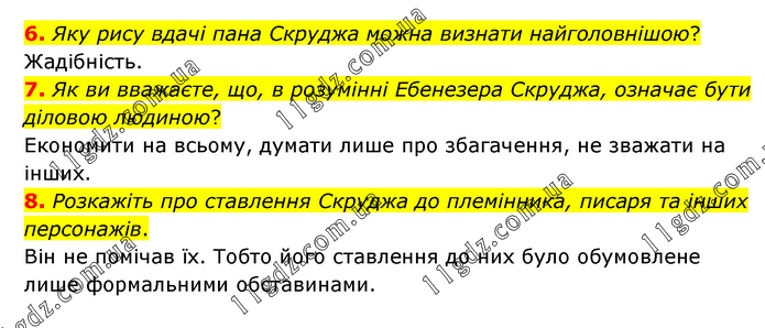 6. Яку рису вдачі пана Скруджа можна визнати найголовнішою? Жадібність. 7. Як ви вважаєте, що, в розумінні Ебенезера Скруджа, означає бути діловою людиною? Економити на всьому, думати лише про збагачення, не зважати на інших. 8. Розкажіть про ставлення Скруджа до племінника, писаря та інших персонажів. Він не помічав їх. Тобто його ставлення до них було обумовлене лише формальними обставинами.