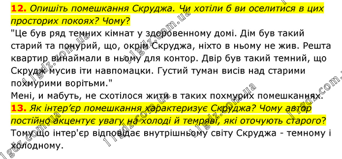 12. Опишіть помешкання Скруджа. Чи хотіли б ви оселитися в цих просторих покоях? Чому? "Це був ряд темних кімнат у здоровенному домі. Дім був такий старий та понурий, що, окрім Скруджа, ніхто в ньому не жив. Решта квартир винаймали в ньому для контор. Двір був такий темний, що Скрудж мусив іти навпомацки. Густий туман висів над старими похмурими ворітьми." Мені, и мабуть, не схотілося жити в таких похмурих помешканнях. 13. Як інтер’єр помешкання характеризує Скруджа? Чому автор постійно акцентує увагу на холоді й темряві, які оточують старого? Тому що інтер'єр відповідає внутрішньому світу Скруджа - темному і холодному.