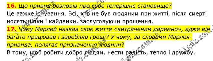 16. Що привид розповів про своє теперішнє становище? Це важке існування. Всі, хто не був людяним при житті, після смерті носять ціпки і кайданки, заслуговуючи прощення. 17. Чому Марлей назвав своє життя «витраченим даремно», адже він багато працював і заробляв гроші? У чому, за словами Марлея-привида, полягає призначення людини? В тому, щоб робити добро людям, нести радість, тепло і дружбу.