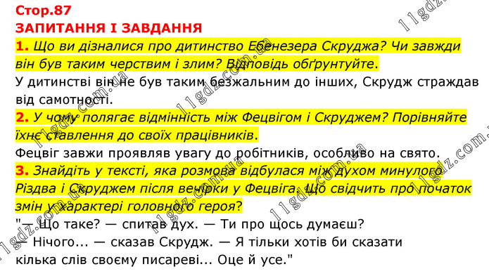 ЗАПИТАННЯ І ЗАВДАННЯ 1. Що ви дізналися про дитинство Ебенезера Скруджа? Чи завжди він був таким черствим і злим? Відповідь обґрунтуйте. У дитинстві він не був таким безжальним до інших, Скрудж страждав від самотності. 2. У чому полягає відмінність між Фецвігом і Скруджем? Порівняйте їхнє ставлення до своїх працівників. Фецвіг завжи проявляв увагу до робітників, особливо на свято. 3. Знайдіть у тексті, яка розмова відбулася між духом минулого Різдва і Скруджем після вечірки у Фецвіга. Що свідчить про початок змін у характері головного героя? "— Що таке? — спитав дух. — Ти про щось думаєш? — Нічого... — сказав Скрудж. — Я тільки хотів би сказати кілька слів своєму писареві... Оце й усе."
