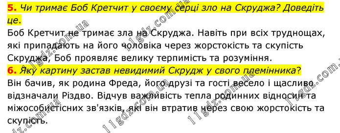 5. Чи тримає Боб Кретчит у своєму серці зло на Скруджа? Доведіть це. Боб Кретчит не тримає зла на Скруджа. Навіть при всіх труднощах, які припадають на його чоловіка через жорстокість та скупість Скруджа, Боб проявляє велику терпимість та розуміння. 6. Яку картину застав невидимий Скрудж у свого племінника? Він бачив, як родина Фреда, його друзі та гості весело і щасливо відзначали Різдво. Відчув важливість тепла родинних відносин та міжособистісних зв'язків, які він втратив через свою жорстокість та скупість.