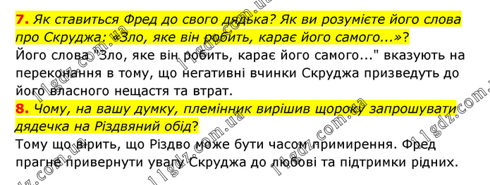 7. Як ставиться Фред до свого дядька? Як ви розумієте його слова про Скруджа: «Зло, яке він робить, карає його самого...»? Його слова "Зло, яке він робить, карає його самого..." вказують на переконання в тому, що негативні вчинки Скруджа призведуть до його власного нещастя та втрат. 8. Чому, на вашу думку, племінник вирішив щороку запрошувати дядечка на Різдвяний обід? Тому що вірить, що Різдво може бути часом примирення. Фред прагне привернути увагу Скруджа до любові та підтримки рідних.