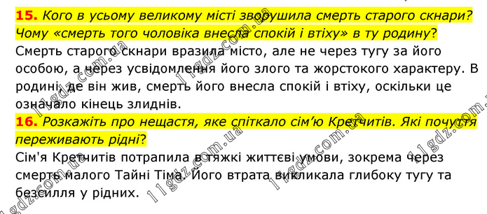 15. Кого в усьому великому місті зворушила смерть старого скнари? Чому «смерть того чоловіка внесла спокій і втіху» в ту родину? Смерть старого скнари вразила місто, але не через тугу за його особою, а через усвідомлення його злого та жорстокого характеру. В родині, де він жив, смерть його внесла спокій і втіху, оскільки це означало кінець злиднів. 16. Розкажіть про нещастя, яке спіткало сім’ю Кретчитів. Які почуття переживають рідні? Сім'я Кретчитів потрапила в тяжкі життєві умови, зокрема через смерть малого Тайні Тіма. Його втрата викликала глибоку тугу та безсилля у рідних.