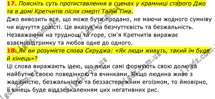 17. Поясніть суть протиставлення в сценах у крамниці старого Джо та в домі Кретчитів після смерті Тайні Тіма. Джо вивозить все, що може бути продано, не маючи жодного сумніву чи відчуття совісті. Це вказує на безчуттєвість та безжальність. Незважаючи на труднощі та горе, сім'я Кретчитів виражає взаємопідтримку та любов одне до одного. 18. Як ви розумієте слова Скруджа: «Як люди живуть, такий їм буде й кінець»? Ці слова виражають ідею, що люди самі формують свою долю та майбутнє своєю поведінкою та вчинками. Якщо людина живе з жадібністю, безжальністю та беззастережним егоїзмом, то ймовірно, її кінець буде віддзеркаленням цих негативних рис.