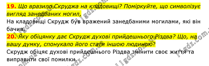 19. Що вразило Скруджа на кладовищі? Поміркуйте, що символізує вигляд занедбаних могил. На кладовищі Скрудж був вражений занедбаними могилами, які він бачив. 20. Яку обіцянку дає Скрудж духові прийдешнього Різдва? Що, на вашу думку, спонукало його стати іншою людиною? Скрудж обіцяє духові прийдешнього Різдва змінити своє життя та виправити свої помилки.