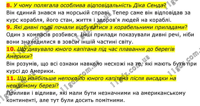 8. У чому полягала особлива відповідальність Діка Сенда? Він єдиний знався на морській справі. Тепер саме він відповідав за курс корабля, його стан, життя і здоров'я людей на кораблі. 9. Які дивні події почали відбуватися з корабельними приладами? Один з компасів розбився. Інші прилади показували дивні речі, ніби вони знаходилися в зовсім іншій частині світу. 10. Що дивувало юного капітана під час плавання до берегів Америки? Він розумів, що всі ознаки навколо несхожі на те, які мають бути при курсі до Америки. 11. Що найбільше непокоїло юного капітана після висадки на невідомому березі? Приливи і відливи, які мали бути незначними на американському континенті, але тут були досить помітними.