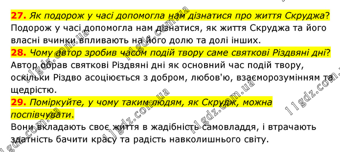 27. Як подорож у часі допомогла нам дізнатися про життя Скруджа? Подорож у часі допомогла нам дізнатися, як життя Скруджа та його власні вчинки впливають на його долю та долі інших. 28. Чому автор зробив часом подій твору саме святкові Різдвяні дні? Автор обрав святкові Різдвяні дні як основний час подій твору, оскільки Різдво асоціюється з добром, любов'ю, взаєморозумінням та щедрістю. 29. Поміркуйте, у чому таким людям, як Скрудж, можна поспівчувати. Вони вкладають своє життя в жадібність самовладдя, і втрачають здатність бачити красу та радість навколишнього світу.