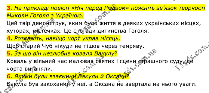 3. На прикладі повісті «Ніч перед Різдвом» поясніть зв’язок творчості Миколи Гоголя з Україною. Цей твір демонструє, яким було життя в деяких українських місцях, хуторах, містечках. Це спогади дитинства Гоголя. 4. Розкажіть, навіщо чорт украв місяць. Щоб старий Чуб нікуди не пішов через темряву. 5. За що він незлюбив коваля Вакулу? Коваль у вільний час малював святих і сцени страшного суду, де чорта виганяли. 6. Якими були взаємини Вакули й Оксани? Вакула був закоханий у неї, а Оксана не звертала на нього уваги.