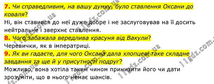 7. Чи справедливим, на вашу думку, було ставлення Оксани до коваля? Ні, він ставився до неї дуже добре і не заслуговував на її досить нейтральне і зверхнє ставлення. 8. Чого забажала вередлива красуня від Вакули? Черевички, як в імператриці. 9. Як ви гадаєте, для чого Оксана дала хлопцеві таке складне завдання та ще й у присутності подруг? Можливо, вона хотіла таким чином принизити його чи дати зрозуміти, що в нього немає шансів.