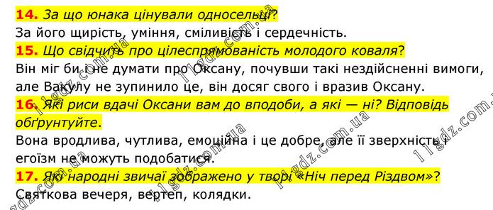 14. 3а що юнака цінували односельці? За його щирість, уміння, сміливість і сердечність. 15. Що свідчить про цілеспрямованість молодого коваля? Він міг би і не думати про Оксану, почувши такі нездійсненні вимоги, але Вакулу не зупинило це, він досяг свого і вразив Оксану. 16. Які риси вдачі Оксани вам до вподоби, а які — ні? Відповідь обґрунтуйте. Вона вродлива, чутлива, емоційна і це добре, але її зверхність і егоїзм не можуть подобатися. 17. Які народні звичаї зображено у творі «Ніч перед Різдвом»? Святкова вечеря, вертеп, колядки.