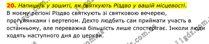 Напишіть у зошиті, як святкують Різдво у вашій місцевості. В моєму регіоні Різдво святкують зі святковою вечерею, прогулянками і вертепом. Дехто людбить сам приймати участь в останньому, але переважна більшість лише спостерігає. Інколи люди ходять наступного дня до церкви.