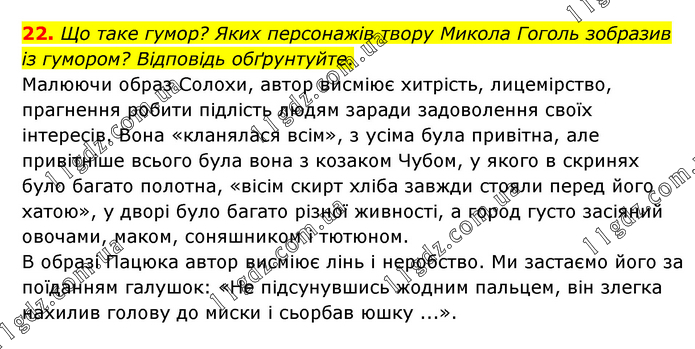Що таке гумор? Яких персонажів твору Микола Гоголь зобразив із гумором? Відповідь обґрунтуйте. Малюючи образ Солохи, автор висміює хитрість, лицемірство, прагнення робити підлість людям заради задоволення своїх інтересів. Вона «кланялася всім», з усіма була привітна, але привітніше всього була вона з козаком Чубом, у якого в скринях було багато полотна, «вісім скирт хліба завжди стояли перед його хатою», у дворі було багато різної живності, а город густо засіяний овочами, маком, соняшником і тютюном. В образі Пацюка автор висміює лінь і неробство. Ми застаємо його за поїданням галушок: «Не підсунувшись жодним пальцем, він злегка нахилив голову до миски і сьорбав юшку ...».